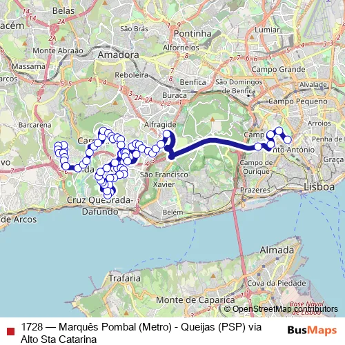 Bus 1728 - Marquês Pombal (Metro) - Queijas (PSP) via Alto Sta Catarina Schedule in Lisbon