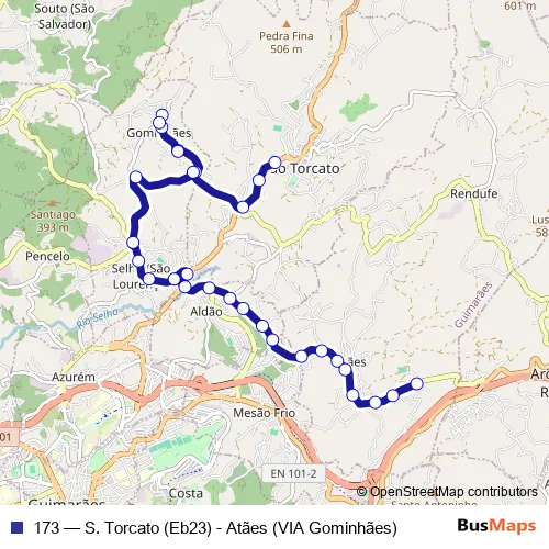 The first stop of the 173 bus route is S. Torcato (Eb23) and the last stop is Atães (Campo DE Jogos). 173 (S. Torcato (Eb23) - Atães (VIA Gominhães)) is operational during on weekdays.