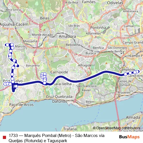 Click here to view the nearest 1733 - Marquês Pombal (Metro) - São Marcos via Queijas (Rotunda) e Taguspark bus stop.