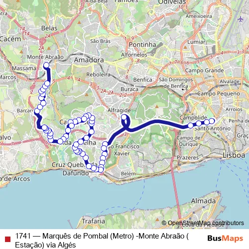 The first stop of the 1741 bus route is Marquês de Pombal (Metro) P3 and the last stop is Monte Abraão (Estação) P12. 1741 (Marquês de Pombal (Metro) -Monte Abraão (Estação) via Algés) is operational during everyday.