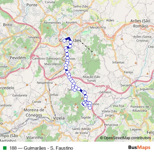 The first stop of the 188 bus route is Central DE Camionagem (Terminal) - Cais 25 and the last stop is S. Faustino (Sino). 188 (Guimarães - S. Faustino) is operational during on weekdays.