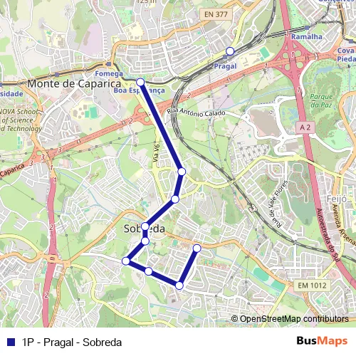 The first stop of the 1P - Pragal - Sobreda bus route is Pragal (Est Ferroviária) and the last stop is Sobreda (Avª República) J Caetano (Fte C C V Atlân. 1P - Pragal - Sobreda (1P - Pragal - Sobreda) is operational during everyday.