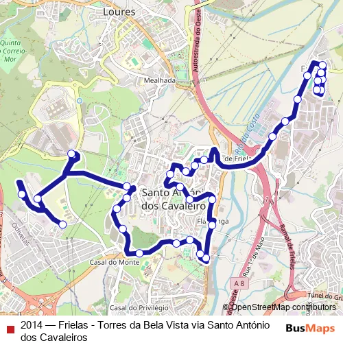 Click here to view the nearest 2014 - Frielas - Torres da Bela Vista via Santo António dos Cavaleiros bus stop.