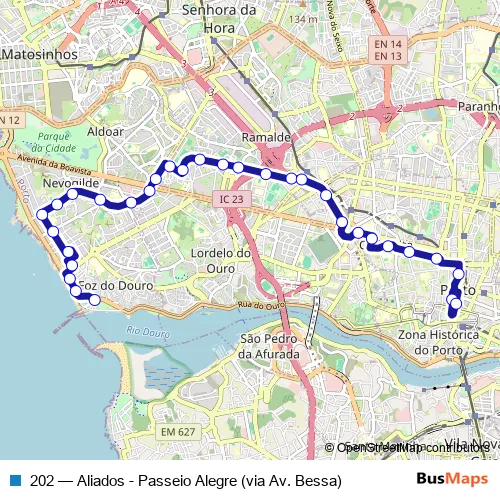 The first stop of the 202 bus route is Passeio Alegre and the last stop is Aliados. 202 (Aliados - Passeio Alegre (via Av. Bessa)) is operational during everyday.
