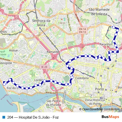 The first stop of the 204 bus route is Hosp. S. João (Urgência) and the last stop is Foz. 204 (Hospital De S.João - Foz) is operational during everyday.