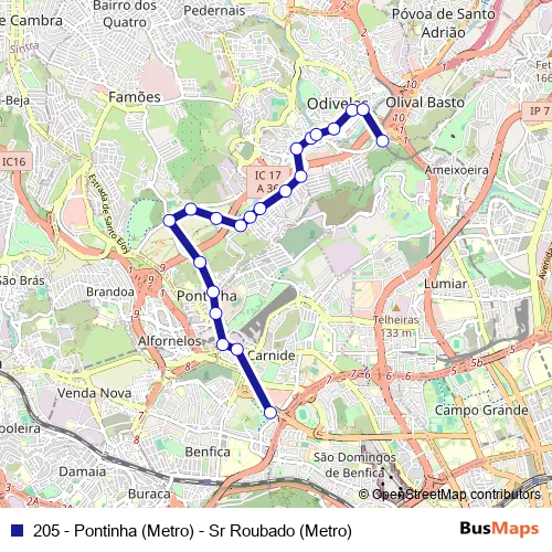 205 - Pontinha (Metro) - Sr Roubado (Metro) bus Route Map