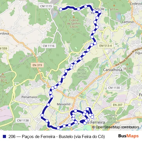 The first stop of the 206 bus route is Bustelo and the last stop is Paços de Ferreira (Parque Urbano). 206 (Paços de Ferreira - Bustelo (via Feira do Cô)) is operational during on weekdays.
