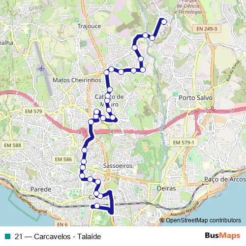 The first stop of the 21 bus route is Carcavelos - Estação - Cais 2 and the last stop is Talaíde. 21 (Carcavelos - Talaíde) is operational during everyday.