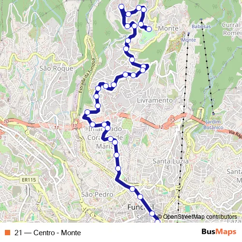 The first stop of the 21 bus route is Monte Corujeira PQ (1557) and the last stop is Alfândega (154). 21 (Centro - Monte) is operational during everyday.