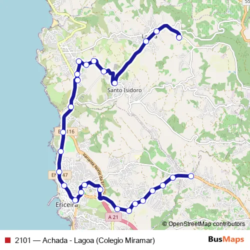 The first stop of the 2101 bus route is Estr Casal da Cruz 38 (Colégio Miramar) and the last stop is En 116 (X) Estr Sto Isidoro. 2101 (Achada - Lagoa (Colegio Miramar)) is operational during on weekdays.