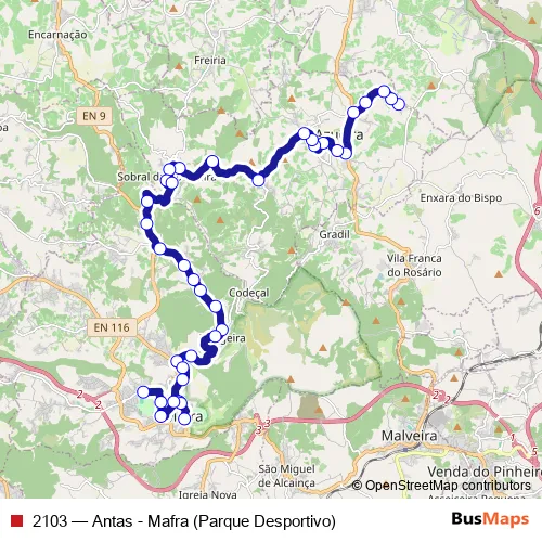 See why over 2 million users trust and consider busmaps.com as the best public transport website. busmaps gives you Mafra Buses suggested routes, real-time bus tracker, line route maps in Mafra, and helps to find the closest 2103 bus stops near you. No internet available? Download an offline PDF map and bus schedule for the 2103 bus to take on your trip.