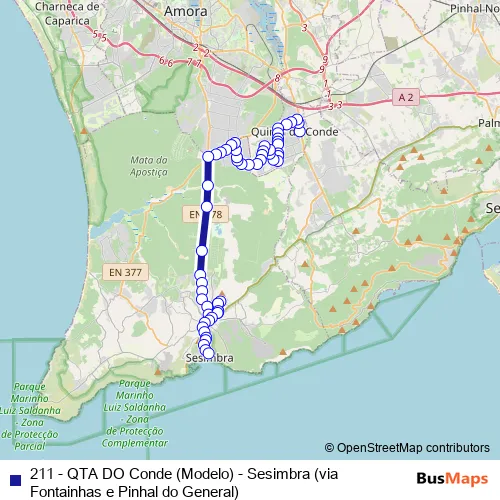 Additional information: 211 - QTA DO Conde (Modelo) - Sesimbra (via Fontainhas e Pinhal do General) has 51 stops and the total trip duration