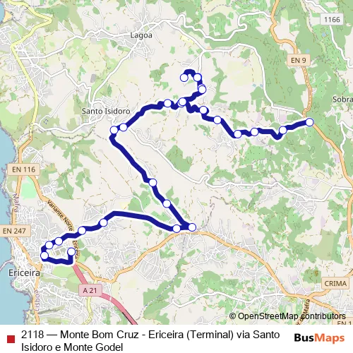 Click here to view the nearest 2118 - Monte Bom Cruz - Ericeira (Terminal) via Santo Isidoro e Monte Godel bus stop.
