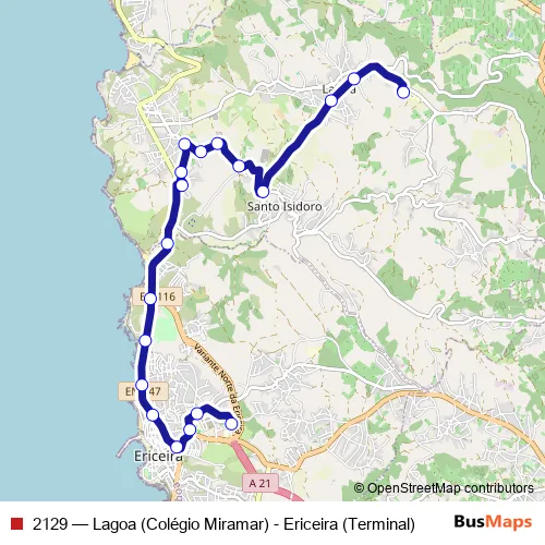 Click here to view the nearest 2129 - Lagoa (Colégio Miramar) - Ericeira (Terminal) bus stop.