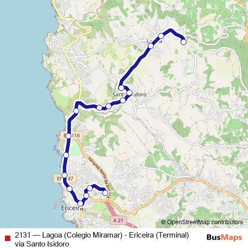Click here to view the nearest 2131 - Lagoa (Colegio Miramar) - Ericeira (Terminal) via Santo Isidoro bus stop.