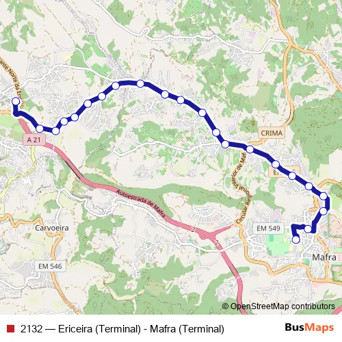 The first stop of the 2132 bus route is Ericeira (Terminal Rodoviário) P1 and the last stop is Parque Intermodal de Mafra P1. 2132 (Ericeira (Terminal) - Mafra (Terminal)) is operational during on weekdays.