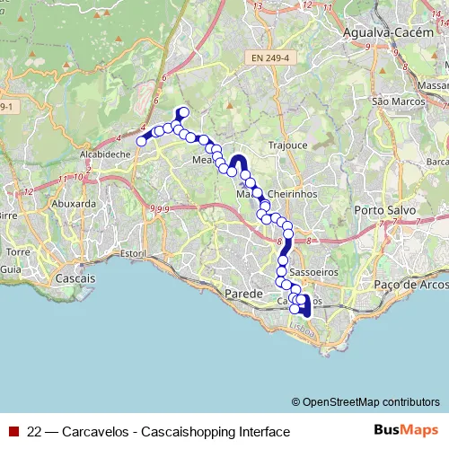 The first stop of the 22 bus route is Cascaishopping - Terminal and the last stop is Carcavelos - Estação - Cais 2. 22 (Carcavelos - Cascaishopping Interface) is operational during everyday.