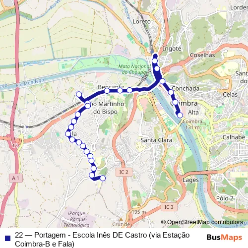 The first stop of the 22 bus route is Portagem and the last stop is Escola Inês de Castro. 22 (Portagem - Escola Inês DE Castro (via Estação Coimbra-B e Fala)) is operational during everyday.
