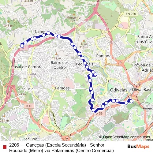 Click here to view the nearest 2206 - Caneças (Escola Secundária) - Senhor Roubado (Metro) via Patameiras (Centro Comercial) bus stop.