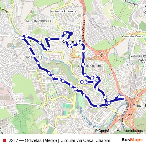 The first stop of the 2217 bus route is Odivelas (Metro) P6 and the last stop is Odivelas (Metro) P4. 2217 (Odivelas (Metro) | Circular via Casal Chapim) is operational during on weekdays.