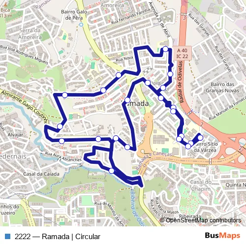 The first stop of the 2222 bus route is R Fernando Lopes Graça (C Chapim) and the last stop is R Fernando Lopes Graça (C Chapim). 2222 (Ramada | Circular) is operational during everyday.