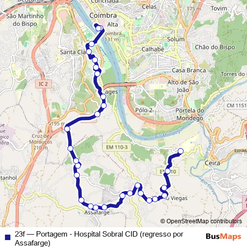 The first stop of the 23f bus route is Hospital Sobral Cid and the last stop is Portagem (Beira Rio). 23f (Portagem - Hospital Sobral CID (regresso por Assafarge)) is operational during on weekends.