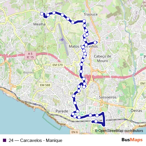 The first stop of the 24 bus route is Carcavelos - Estação - Cais 3 and the last stop is Calçada do Rio. 24 (Carcavelos - Manique) is operational during on weekdays.