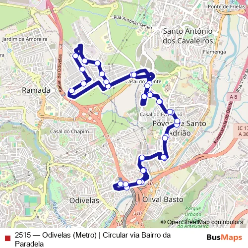 The first stop of the 2515 bus route is Odivelas (Metro) P6 and the last stop is Odivelas (Metro) P4. 2515 (Odivelas (Metro) | Circular via Bairro da Paradela) is operational during on weekdays.