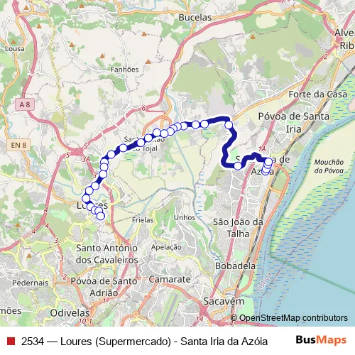 The first stop of the 2534 bus route is Lgo S Francisco Xavier and the last stop is R Professor Egas Moniz (Supermercado). 2534 (Loures (Supermercado) - Santa Iria da Azóia) is operational during everyday.