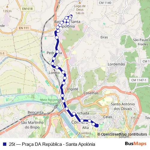 See why over 2 million users trust and consider busmaps.com as the best public transport website. busmaps gives you Coimbra Buses suggested routes, real-time bus tracker, line route maps in Coimbra, and helps to find the closest 25t bus stops near you. No internet available? Download an offline PDF map and bus schedule for the 25t bus to take on your trip.