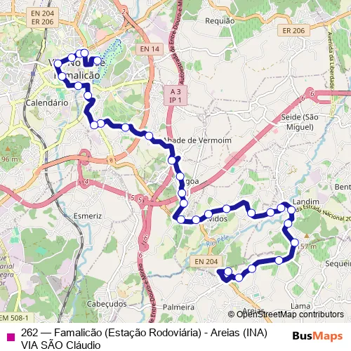 The first stop of the 262 bus route is Inst. NUN'Alvares and the last stop is Estação Rodoviária V.N. Famalicão (Antas). 262 (Famalicão (Estação Rodoviária) - Areias (INA) VIA SÃO Cláudio) is operational during everyday.