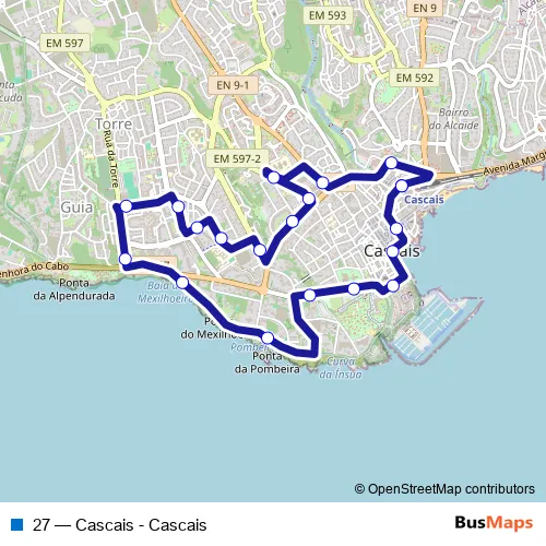 The first stop of the 27 bus route is Cascais Estação - Av. Marginal and the last stop is Cascais Estação - Av. Marginal. 27 (Cascais - Cascais) is operational during everyday.