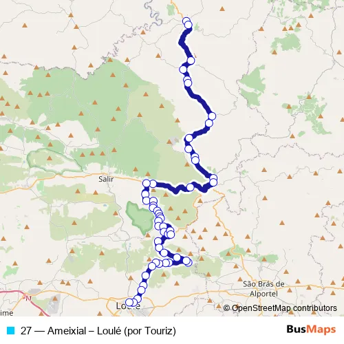 The first stop of the 27 bus route is Ameixial (Gasolineira) and the last stop is Loulé (Terminal Rodoviário). 27 (Ameixial – Loulé (por Touriz)) is operational during on weekdays.