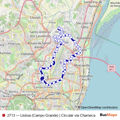 The first stop of the 2713 bus route is Campo Grande (Metro) P18 and the last stop is Campo Grande (Metro) P30. 2713 (Lisboa (Campo Grande) | Circular via Charneca) is operational during everyday.