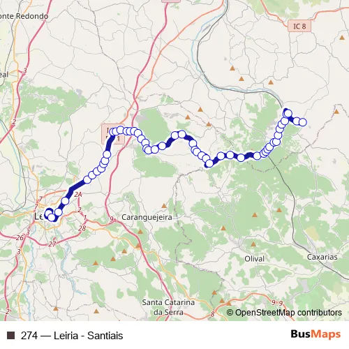 The first stop of the 274 bus route is Leiria (Terminal) and the last stop is Santiais (Centro). 274 (Leiria - Santiais) is operational during on weekdays.