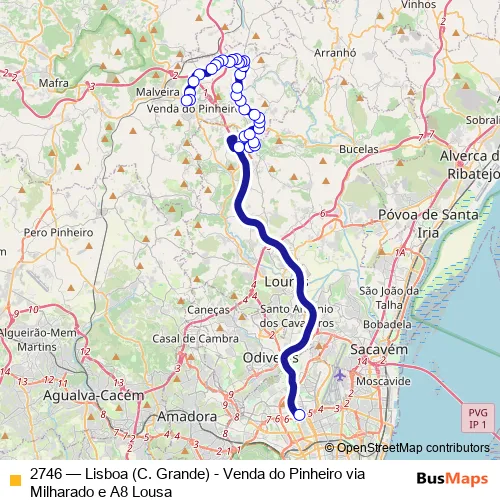 Click here to view the nearest 2746 - Lisboa (C. Grande) - Venda do Pinheiro via Milharado e A8 Lousa bus stop.