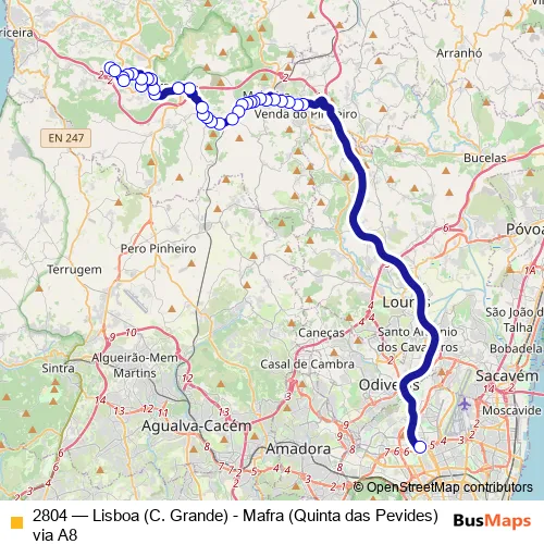 Click here to view the nearest 2804 - Lisboa (C. Grande) - Mafra (Quinta das Pevides) via A8 bus stop.