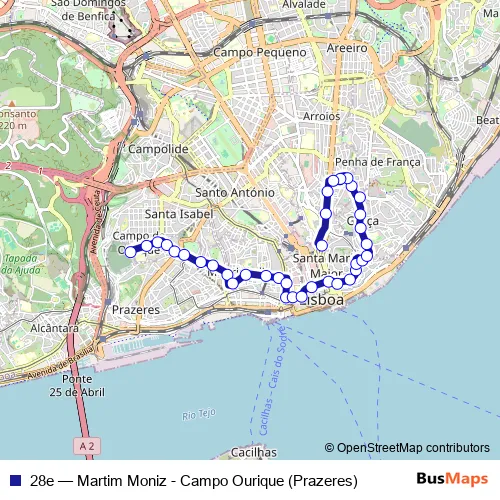 The first stop of the 28e bus route is Campo Ourique (Prazeres) and the last stop is Martim Moniz. 28e (Martim Moniz - Campo Ourique (Prazeres)) is operational during everyday.