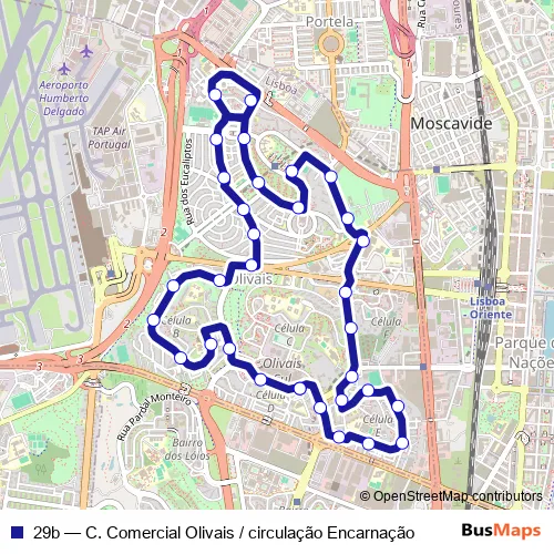 The first stop of the 29b bus route is C. Comercial Olivais and the last stop is C. Comercial Olivais. 29b (C. Comercial Olivais / circulação Encarnação) is operational during everyday.