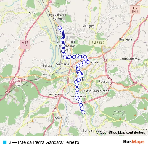 The first stop of the 3 bus route is N109 / Matoeira and the last stop is Rua Imaculada Conceição 127. 3 (P.te da Pedra Gândara/Telheiro) is operational during everyday.