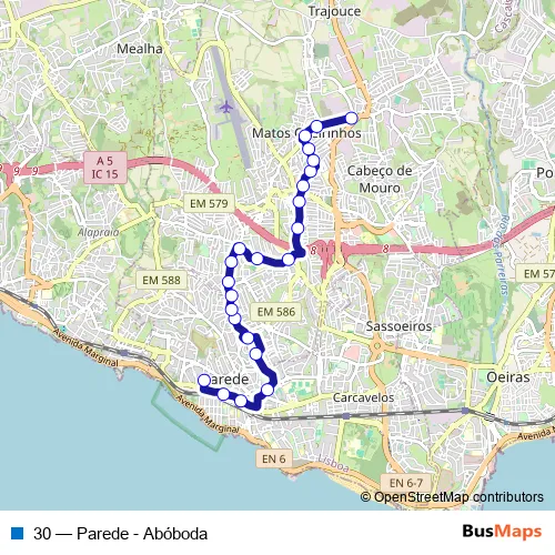 The first stop of the 30 bus route is Parede - Terminal - Cais 1 and the last stop is Abóboda - Terminal. 30 (Parede - Abóboda) is operational during everyday.