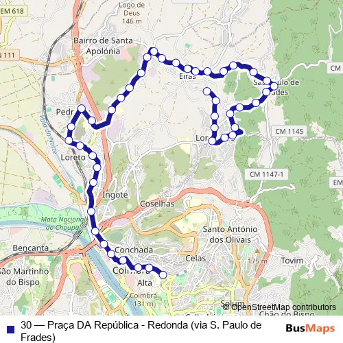 See why over 2 million users trust and consider busmaps.com as the best public transport website. busmaps gives you Coimbra Buses suggested routes, real-time bus tracker, line route maps in Coimbra, and helps to find the closest 30 bus stops near you. No internet available? Download an offline PDF map and bus schedule for the 30 bus to take on your trip.