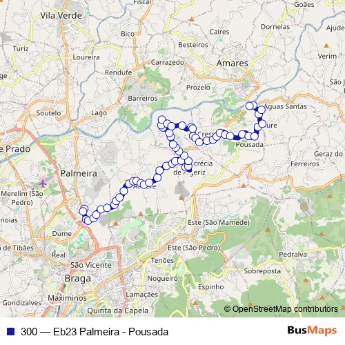 The first stop of the 300 bus route is Santa Lucrécia I and the last stop is Cimo de Vila (Eb23 Palmeira). 300 (Eb23 Palmeira - Pousada) is operational during everyday.