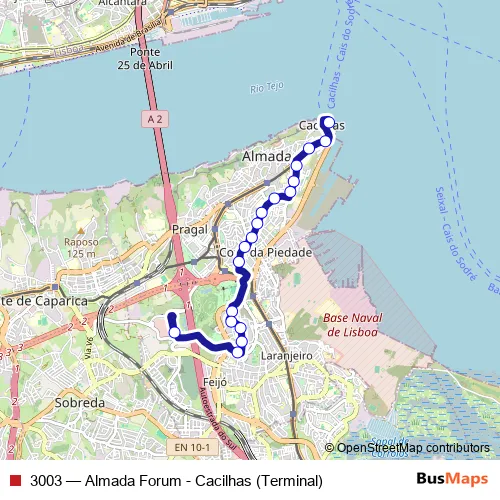The first stop of the 3003 bus route is Cacilhas (Terminal) P10 and the last stop is Centro Comercial de Almada P2. 3003 (Almada Forum - Cacilhas (Terminal)) is operational during everyday.