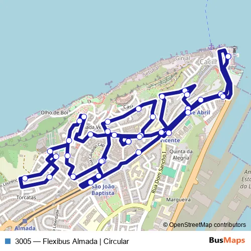 The first stop of the 3005 bus route is Cacilhas (Terminal) P10 and the last stop is Cacilhas (Terminal) P10. 3005 (Flexibus Almada | Circular) is operational during everyday.