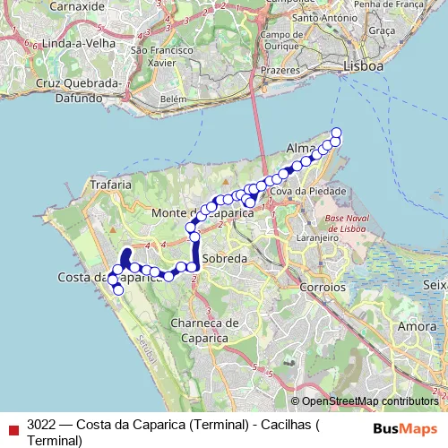 Bus 3022 - Costa da Caparica (Terminal) - Cacilhas (Terminal): Full Schedule in Almada