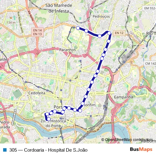 The first stop of the 305 bus route is Hosp. S. João (Circunvalação) and the last stop is Cordoaria. 305 (Cordoaria - Hospital De S.João) is operational during everyday.