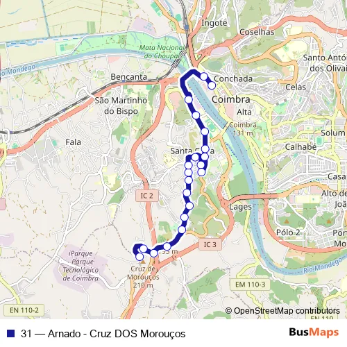 The first stop of the 31 bus route is Cruz dos Morouços (Centro) and the last stop is Largo do Arnado (Av. Fernão de Magalhães). 31 (Arnado - Cruz DOS Morouços) is operational during on weekdays.