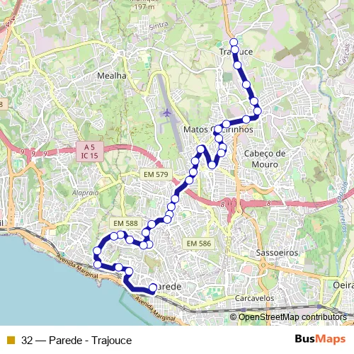 The first stop of the 32 bus route is Largo Rossio Pequeno and the last stop is Parede - Terminal - Cais 4. 32 (Parede - Trajouce) is operational during everyday.
