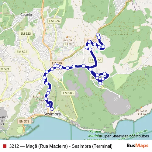 The first stop of the 3212 bus route is Maçã (R Macieira (X) EN 379) and the last stop is Sesimbra (Terminal). 3212 (Maçã (Rua Macieira) - Sesimbra (Terminal)) is operational during everyday.